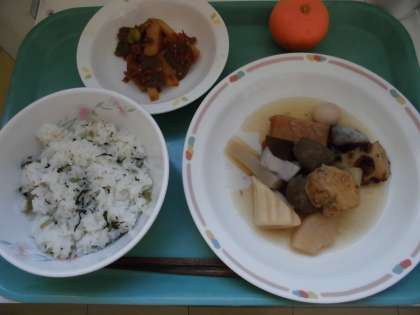 今日の給食は、菜飯、牛乳、大蔵大根おでん、五目きんぴら、みかんです。
