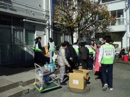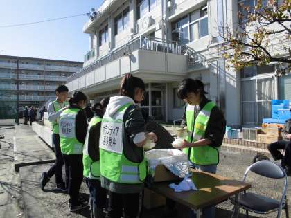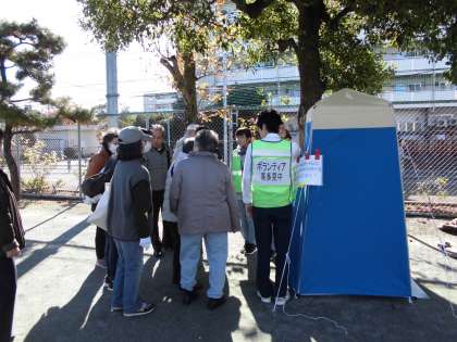 11月30日、喜多見中学校において避難所運営訓練が行われました。中部町会、西部町会。団地自治会の運営委員の方を中心に準備、開設、訓練が行われました。本校からも1年生〜3年生まで17名のボランティアが参加しました。1年生の時から3年間運営訓練に参加している3年生が、1,2年生に動きのアドバイスしていて頼りになる存在でした。マンホールトイレについて説明を受けたり、炊き出しのお手伝いをしました。町会の方から「重い資材を中学生が運んでくれたので助かりました。」「片付けなど率先して動いてくれました。」という言葉をいただきました。もしものことがあったときに、動ける人材として中学生が訓練に積極的にかかわっていきたいです。