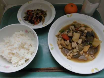 今日の給食は、麦ごはん、牛乳、鶏肉とじゃがいものうま煮、ひじきのごま和え、みかんです。