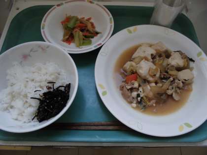 今日の給食は、麦ごはん、牛乳、梅ひじきふりかけ、肉豆腐、野菜の生姜じょうゆがけです。