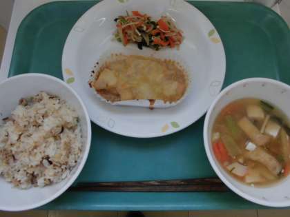 今日の給食は、ムロ節ごはん、牛乳、大蔵大根の味噌チーズグラタン、野菜のからしじょうゆがけ、吉野汁です。