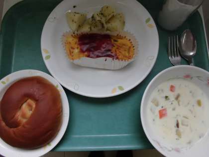 今日の給食は、黒砂糖パン、チーズ入り卵焼き、じゃがいもの香味和え、白身魚のクリームスープです。