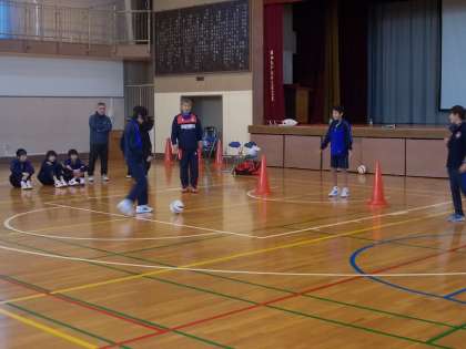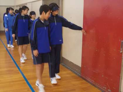 12月14日オリンピックパラリンピックデーとして1年生〜3年生まで「ブラインドサッカー」を体験しました。日本ブラインドサッカー協会からブラインドサッカー選手とスタッフの方に来ていただきました。2人1組になり、アイマスクをつけてブラインド体操やウオーク、ランを体験しました。体操のやり方や歩く場所を言葉だけで相手に伝える難しさを感じました。代表の生徒がアイマスクをつけて見えない状態でボール蹴ったり止めたりすることにも挑戦しました。