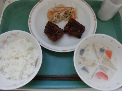 今日の給食は、ごはん、牛乳、鯨の竜田揚げ、はりはり酢の物、飛鳥汁です。