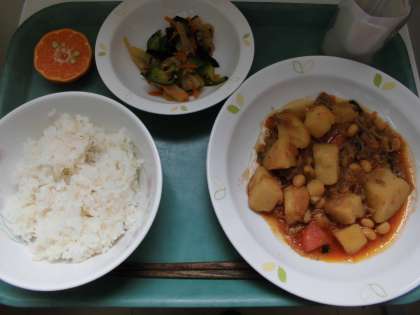 今日の給食は、ごはん、牛乳、韓国風肉じゃが、チョレギサラダ、ぽんかんです。