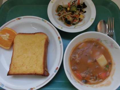 今日の給食は、フレンチトースト、牛乳、海藻サラダ、豆入りポークシチュー、いよかんです。