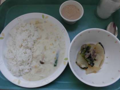 今日の給食は、ライス&シャモ・ケワ・ダツイ、パクシャバ、チャイゼリーです。