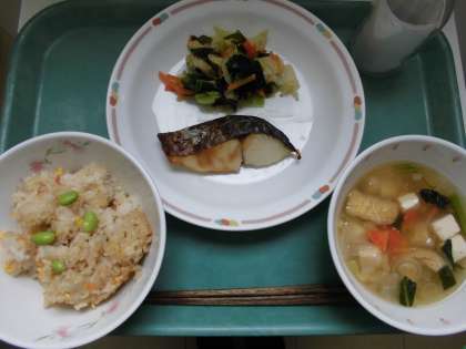 今日の給食は、四色そぼろごはん、牛乳、魚の西京焼き、和風サラダ、吉野汁です。