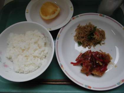 今日の給食は、ごはん、牛乳、白身魚の甘酢あん欠け、切り干しとじゃこのピリ辛炒め、はっさくです。
