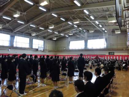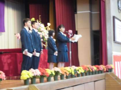 在校生代表の言葉、卒業生の言葉。3年生のみんな、在校生、先生・主事さん方、保護者の皆さんへ感謝の気持ちを心がこもった温かい言葉で伝えていました。3年生のみんなが合唱するはずだった「旅立ちの日に」と「あなたへ」の2曲を音楽科の先生方がピアノとヴィオラで演奏し、BGMとして流しました。