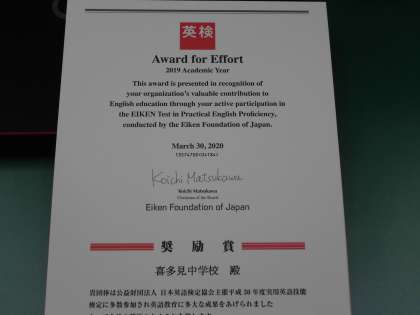 本校では英検の準会場として昨年度もやっており、多数の参加者がいたため奨励賞もいただきました。しかし、今年度の第1回は、コロナウイルス感染予防の観点から学校を通しての校内申込ができない状況です。