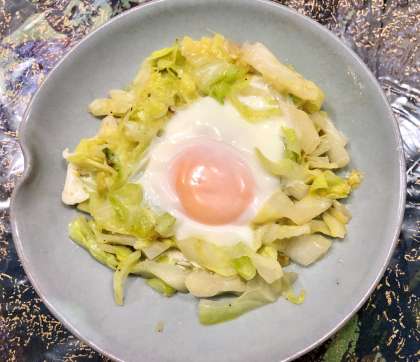 3 キャベツを丸く集めて中心にくぼみをつけたらそこに生玉子を一つ落とします。