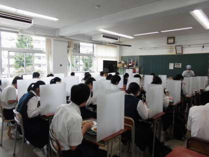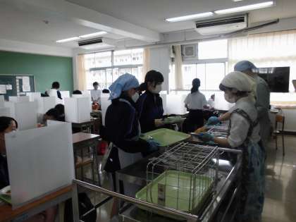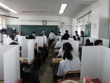 給食が始まって3日目、今日のメニューはキムチチャーハン、大豆とじゃこと芋の甘辛、牛乳です。今週は先生2名と保健給食委員2名で盛り付け、配膳しています。手洗いをし、机やパーティションを拭いて席に着きます。食べているときは、パーティション囲まれて、おしゃべりすることもなく食べることに集中しています。
