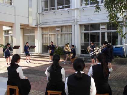 7月2日(木)梅雨の中休み今日は晴れでした。体育の授業や昼休みも校庭で思いいきり身体を動かす姿がありました。放課後の部活動でもサッカー部や野球部が外で活動する中を1年生が見学しました。今日は喜多見中学校名物、中庭の枝垂れ桜の下で吹奏楽部がミニコンサートを行い、1年生が演奏を聴きました。