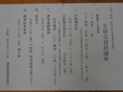 7月20日(月)放送による全校朝礼が行われました。まず、生徒会役員選挙について選挙管理委員長から話がありました。9月に選挙が行われます。また、昨年度3月中表彰できなかった、吹奏楽部、バドミントン部、環境作文、防災標語の入賞者の表彰も行いました。