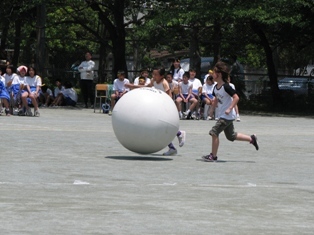 小学生1年生から6年生まで、96名が参加しました。紅白の大玉ころがしです。