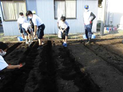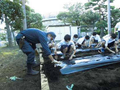 9月4日(金)校舎わきに作られた喜多見中の畑に、いよいよ鍬(くわ)が入れられました。永井様、池田様に指導していただき、各班副班長、手伝ってくれる有志で畝づくり、肥料、腐葉土やり、マルチシートを設置しました。鍬を使って、まっすぐに土を盛り上げる難しさを体験していました。