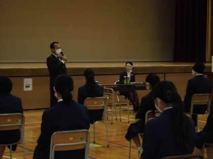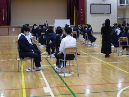 10月9日(金)3年面接用マナー講習会が行われました。昨年度、職場体験前にも講習を受けましたが、今回は入学試験だけでなく、就職試験にも必要になる面接用のマナーを元キャビンアテンダントの方を講師にお迎えして講習が行われました。姿勢や笑顔の大切さや集団討論の仕方などこれから必要になってくるマナーを教えていただきました。