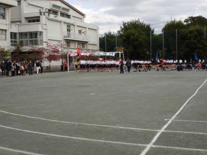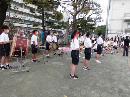 10月24日(土)創立40周年記念運動会 吹奏楽部演奏のファンファーレで始まり、行進曲「海兵隊」の音楽に合わせて行進です。今年度のスローガンは【距離があっても絆は一つ】です。
