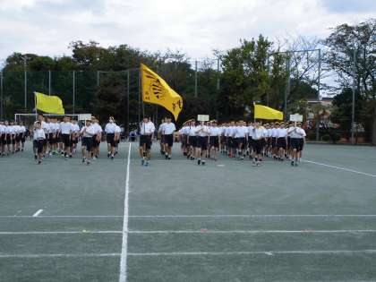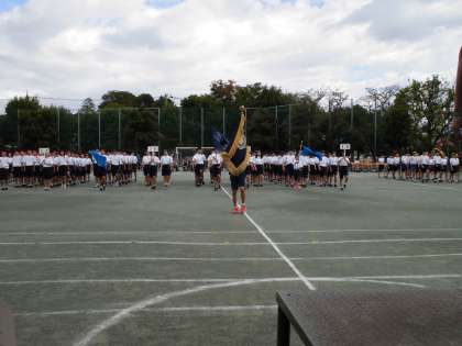 赤組、青組、黄組。各団1年〜3年までそろって行進です。