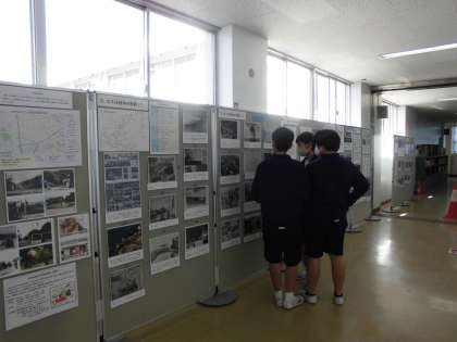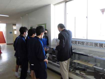 10月22日から11月2日まで喜多見中学校で開催されます。今日10月29日、平和資料館のスタッフの方が昼休みに来てくださいました。生徒たちは興味深く展示品や写真パネルを見て、質問をし、説明をよく聞いていました。