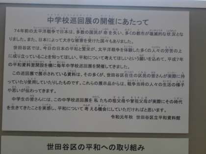 世田谷区では、今日の日本の平和と繁栄が太平洋戦争を体験した多くの人々の労苦の上に成り立っていることを知ってほしい、平和について考えてほしいという願いを込めて中学校巡回展を開催しています。