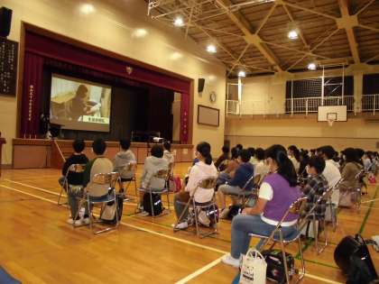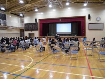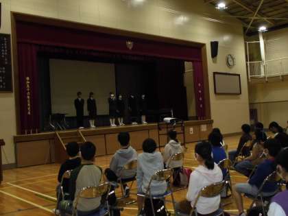 体育館では前半と後半に分かれて、生徒会の説明を聞きました。