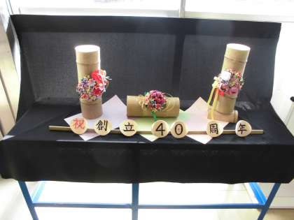 周年行事実行委員の皆さんの手作りの竹箸、箸袋が来賓の方に記念品としてお渡ししました。箸袋は旧標準服の布と校章入りのボタンも使用しました。また、竹を花瓶としてちりめんで作られたお花も手作りのものです。竹は喜多見の竹林のものを使用しました。