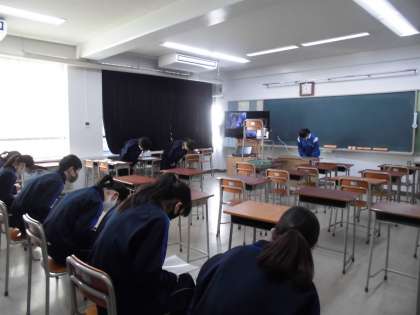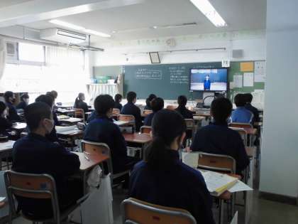 11月30日(月)今までは、放送による音声だけの朝礼をやっていましたが、今回Zoomによる生徒会朝礼を行いました。生徒会本部をはじめ、各委員会の代表の生徒が取組について報告しました。映し出される表情を見ながら、各教室で報告を聞きました。