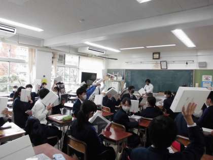 12月9日(水)GIGAスクール構想に基づき生徒用タブレット型情報端末を3年生全員に貸与しました。校内のネットワーク設備が整備されるまでは家庭で活用することが中心になりますが、有効活用ができるようにしていきます。