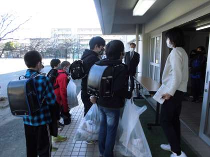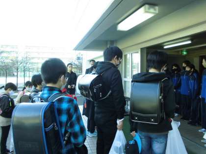 1月13日(水)喜多見小学校の6年生が収穫した小松菜を中学校に届けに来てくれました。感染症対策のため、例年のように直接渡すのではなく、机の上に置いて受け渡しを行いました。立派に育った小松菜を見て、1年生は「去年は自分たちが育てたものを中学校に届けに来たなぁ」と思い出している人もいました。喜多見小6年の皆さんありがとうございました。
