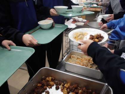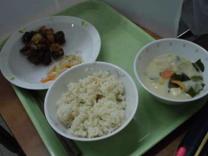 1月28日(木)の給食は、【半つきご飯、飛鳥汁、鯨の竜田揚げ(芋入り)、はりはり酢の物、牛乳】でした。「全国学校給食週間」は、学校給食について理解と関心を深めるため歴史的な給食の献立を出しました。25日(月)は、揚げパン。26日(火)は、明治20年代に山形県鶴町で始まった給食をイメージしたご飯、魚、、みそ汁、野菜。27日(水)は、ソフト麺(ミートソースがけ)そして、28日(木)は、1980年代まではよく食べられていた鯨の竜田揚げでした。