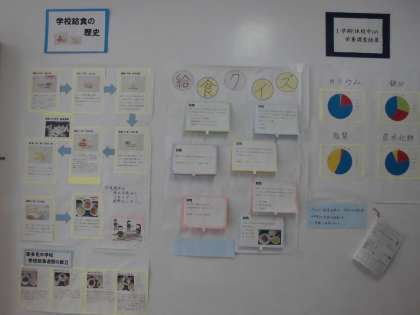 保健給食委員会の取組発表 「食の勉強会」「食育標語(食品ロスについて)」「学校給食の歴史」「休校中の栄養調査結果」