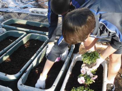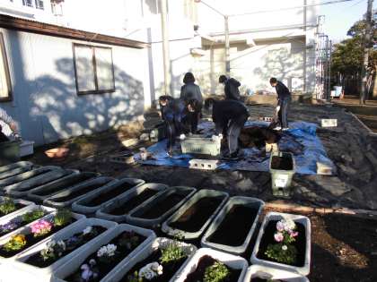 2月16日(火)ボランティア部の活動でプランターに花を植えました。ノースポール、プリムラジュリアン、パンジーなどの花を種類や配色を考えて植えていきました。校内が花いっぱいで明るい春が迎えられるように…