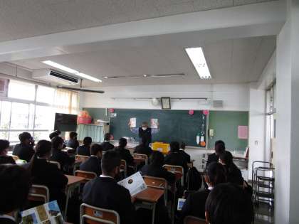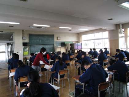 早速、授業が開始されています。最初の授業とあって、先生と生徒の距離だったり、生徒同士の関係づくりや学級の雰囲気作り等に力点が置かれた、工夫された授業が展開されていました。社会科では、ある1年生の生徒が、『先生の好きな時代は何時代ですか?』と質問していたり、音楽では先生が、『好きな音楽ジャンルやアーチストを記入してみて!』など。体育館をのぞいてみれば、何と3年生女子の体育は「だるまさんがころんだ」。 — どの学年もとても楽しそうでした。