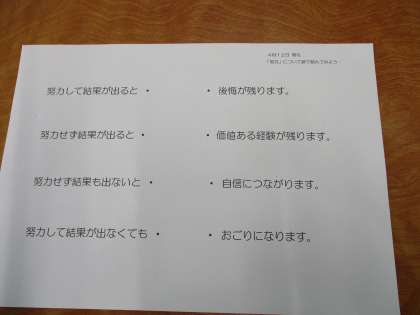 今朝は放送による朝礼から始まりました。校長から、努力に係る4つのパターンについて話をしました。「自信」と「おごり」、「謙虚」と「卑屈」は紙一重。「努力」は即ち「挑戦」ではないか、という問いかけをしました。子どもたちが果敢に挑戦する姿を期待します。
