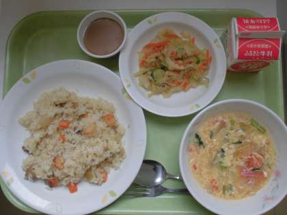 えびピラフ、牛乳、たまごスープ、じゃこサラダ、カフェオレゼリーです。