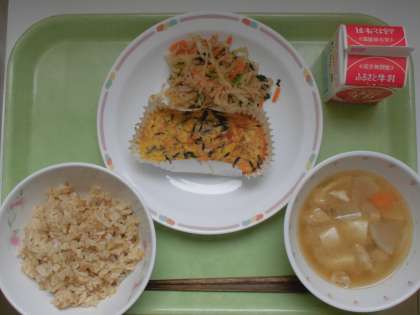そぼろとごぼうのごはん、牛乳、さつま汁、ひじきの卵焼き、切干大根のおかか和えです。