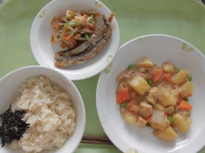 半つきごはん、ひじきふりかけ、牛乳、新じゃがいものそぼろ煮、ししゃものからあげ、野菜の辛子和えです。