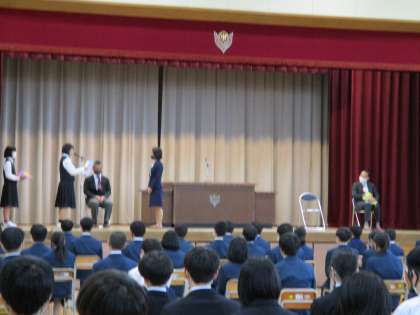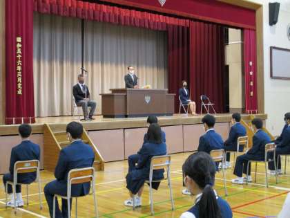 4月30日(金)離任式を行いました。例年は、1年生も参加しますが、今年度は感染症対策のため、2,3年生のみの参加でした。代表の生徒からの言葉は、それぞれの先生のエピソードがあり、感謝の気持ちが込められていました。また、離任された先生方から、この1ヶ月の間も成長し、これからの成長も楽しみにしていると、温かい励ましのお言葉をいただきました。