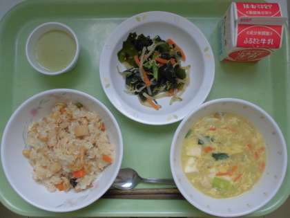 中華おこわ、牛乳、中華風コーンスープ、しゃきしゃきわかめナムル、抹茶プリンです。