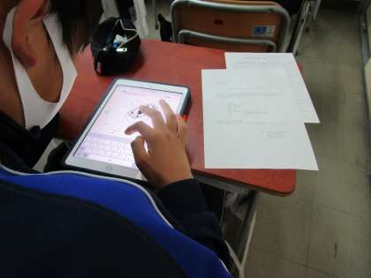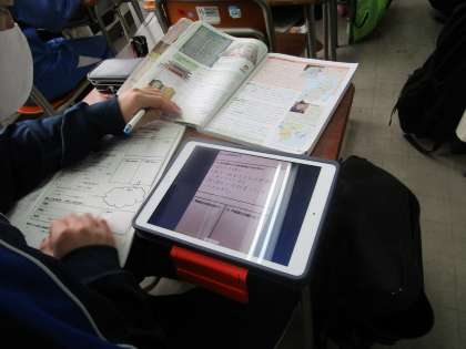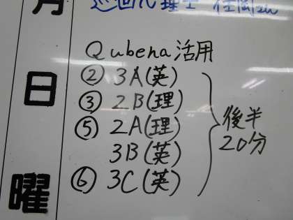 本校では、一人1台タブレットを積極的に活用すべく、職員室でもキャンペーンを展開しています。写真は、職員室内のホワイトボードに書かれた予定、2年生の社会と理科の模様です。今日は、生徒一人ひとりの習熟度に合わせて最適な問題を出題するタブレット教材Qubenaを活用しています。