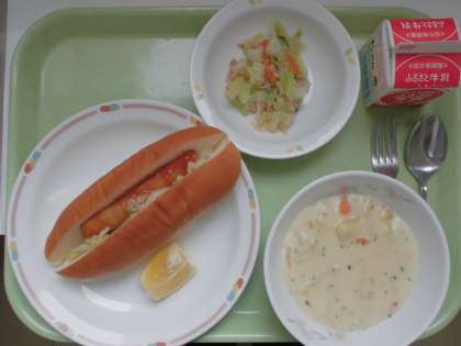 ウインナーサンド、牛乳、クラムチャウダー、ツナサラダ、ニューサマーオレンジです。