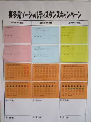 K.S.D.C. 喜多見ソーシャルディスタンスキャンペーンも今日と明日を残すのみとなりました。仲がいいのもほどほどに、「相手を大切にしながら、自分も大事にする」を合言葉にして実践しています。写真は3年生のフロアに張り出されている、取組についての振り返り&明日の目標シート。どの学年も意識の高さが光っています。仲間との距離は広がっても、絆や信頼をますます深くする姿を期待します。