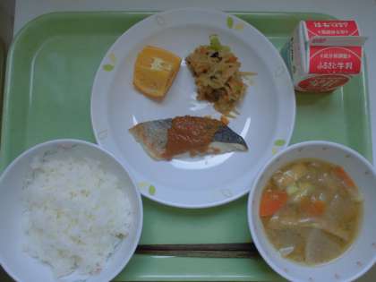 ごはん、牛乳、さつま汁、魚のピリ辛ソース、切干大根の煮つけ、甘夏です。
