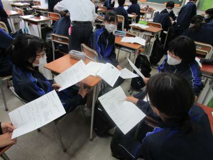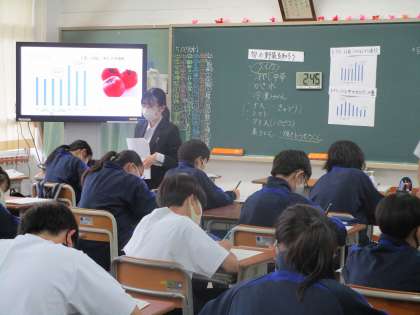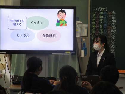本校は都内でも数少ない栄養教諭配置校です。栄養教諭は一人の教諭として、学校給食の運営に当たる一方、学校給食をひとつの教材として食の教育(食育)などを実施し、子どもたちに栄養や食生活の正しい知識を身につけさせることをねらいとして教壇にも立ちます。今日は、富樫栄養教諭の指導のもとで実習を行っている学生による研究授業が行われました。題材は、「旬」の野菜を知ろう — 旬の野菜は価格だけでなく、栄養が豊富であったり、環境にやさしい作物でもあることなど、気付きの多い時間となりました。