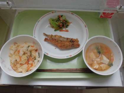 山菜おこわ、牛乳、具だくさんみそ汁、ししゃもの二色フライ、小松菜のあえものです。