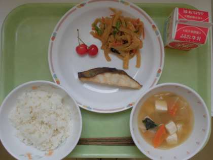 麦ごはん、牛乳、吉野汁、魚の西京焼き、切干大根の煮つけ、さくらんぼです。