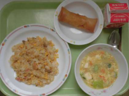 五目チャーハン、牛乳、中華風コーンスープ、豚キムチと小松菜の春巻です。