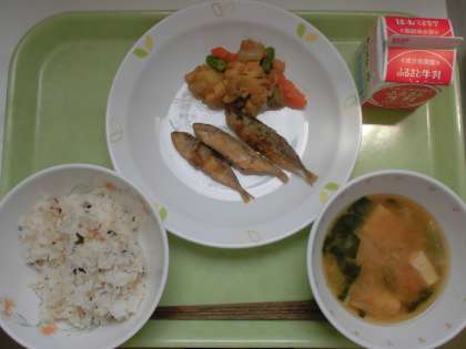 梅わかごはん、牛乳、具だくさんみそ汁、豆あじの南蛮漬け、大豆入り炒り鶏です。